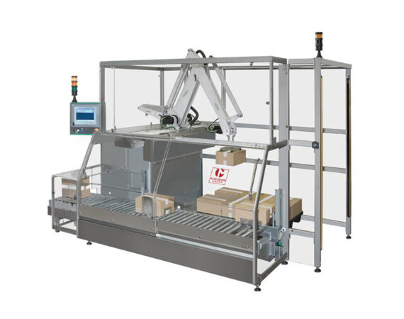 All processes are fully automated, executed by brushless motors, and overseen by a Siemens 677 PC. Shippers are conveyed to the palletizer's pick-up station. The roller belt can be equipped with a turning device or a check weigher before palletizing operations commence.